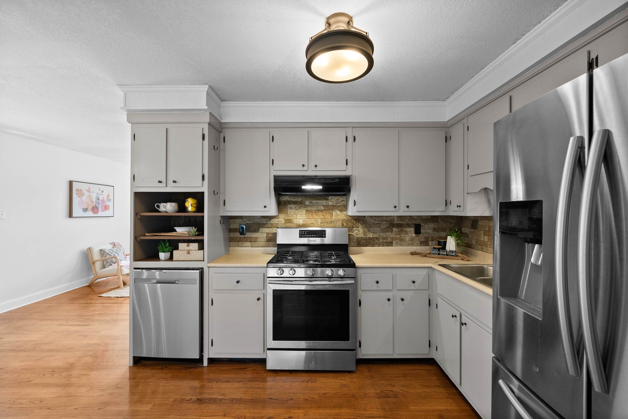 - Oven, Gas Range, Dishwasher, Refrigerator, Stainless Steel Appliance(s)