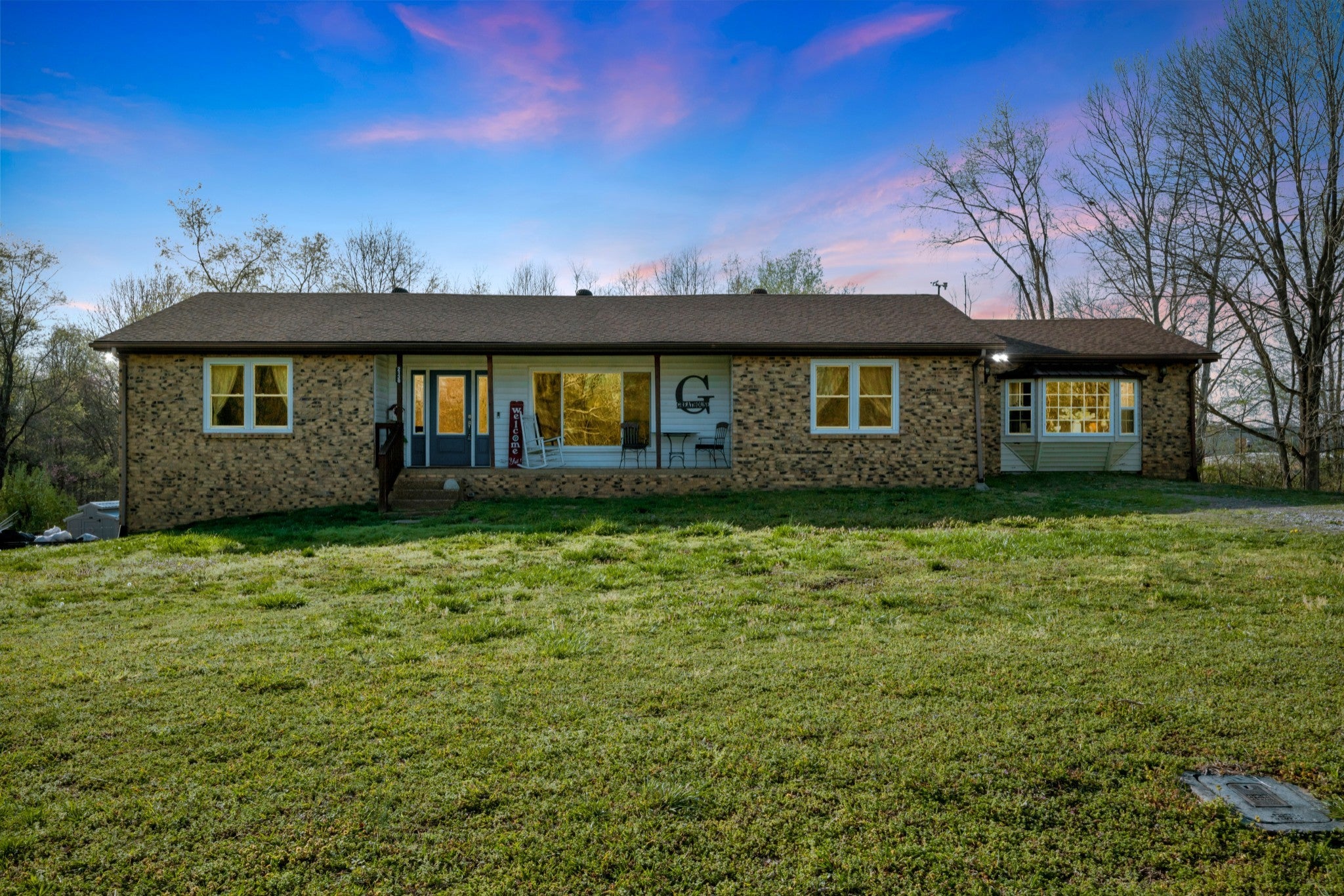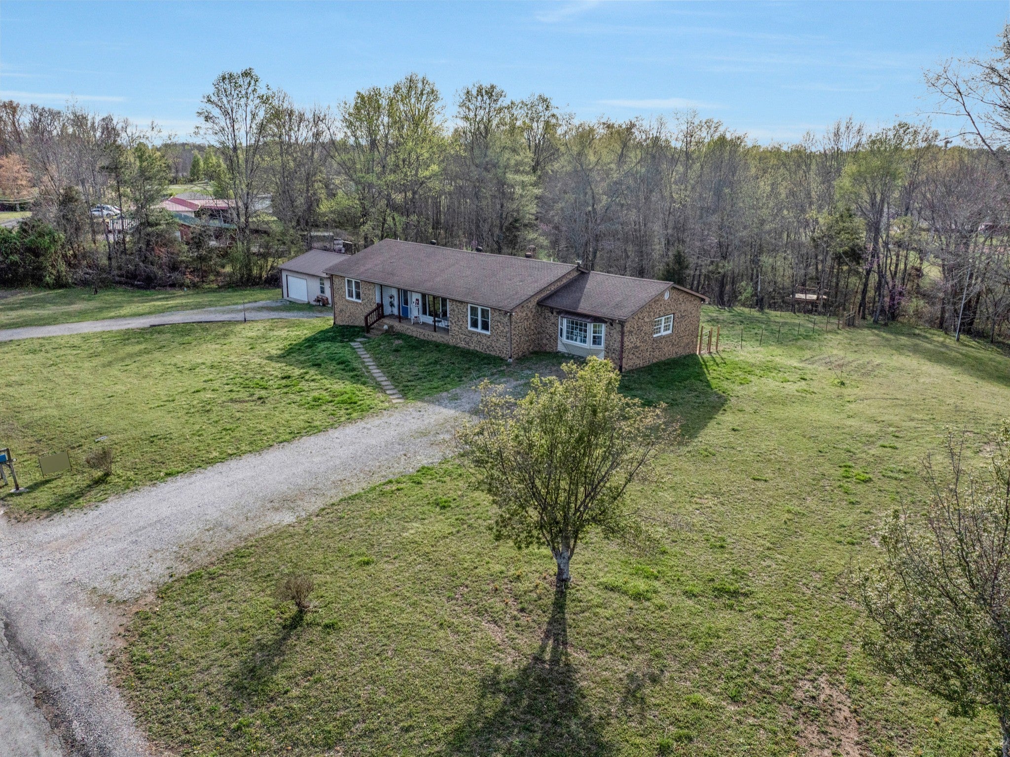 Nice brick home with full basement on 5 acres with fenced back yard and detached shop/garage. Home features new Pella windows in 2021, laminate flooring, split bedroom plan and beamed vaulted ceiling in living room. Large master bedroom with walk-in closet. Luxurious master bath features huge tiled shower, separate bathtub, bay window, double vanities, enclosed toilet room and linen closet. Kitchen features bar stool area, refrigerator, dishwasher, microwave and stove/oven. Laundry room and 8x7 mud room on main level. Full walk-out basement with windows is heated and cooled with large open area and 3 rooms with closets. Convenient location close to schools. Spectrum high speed internet is available. Great yard with treehouse