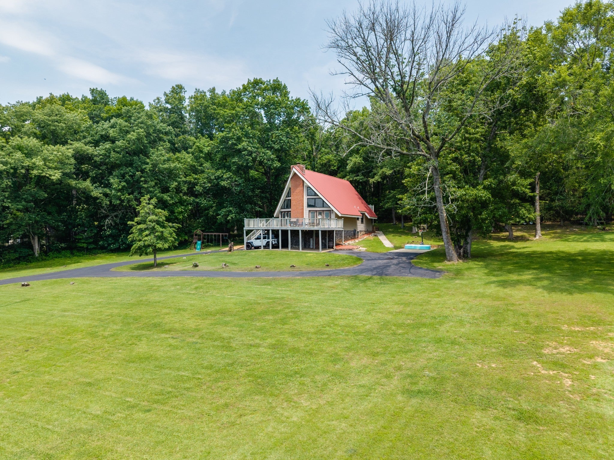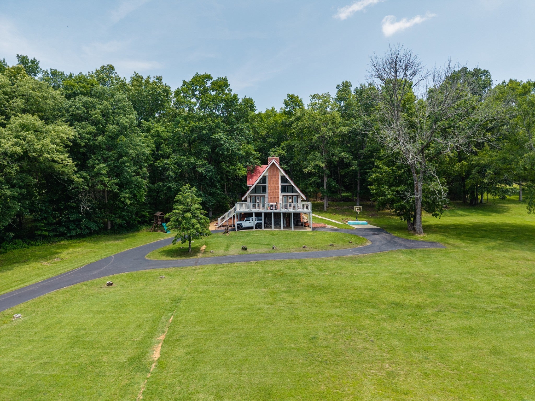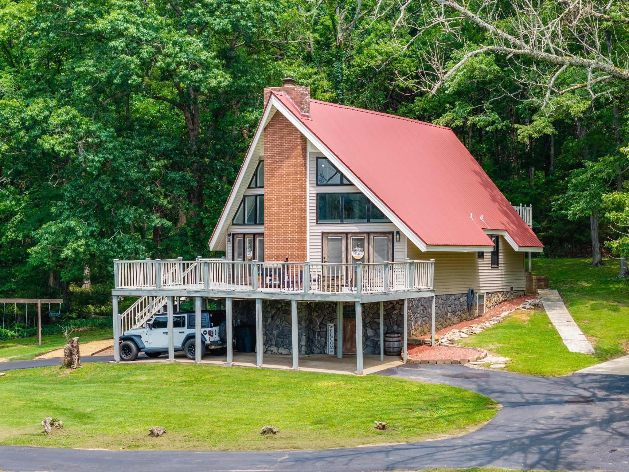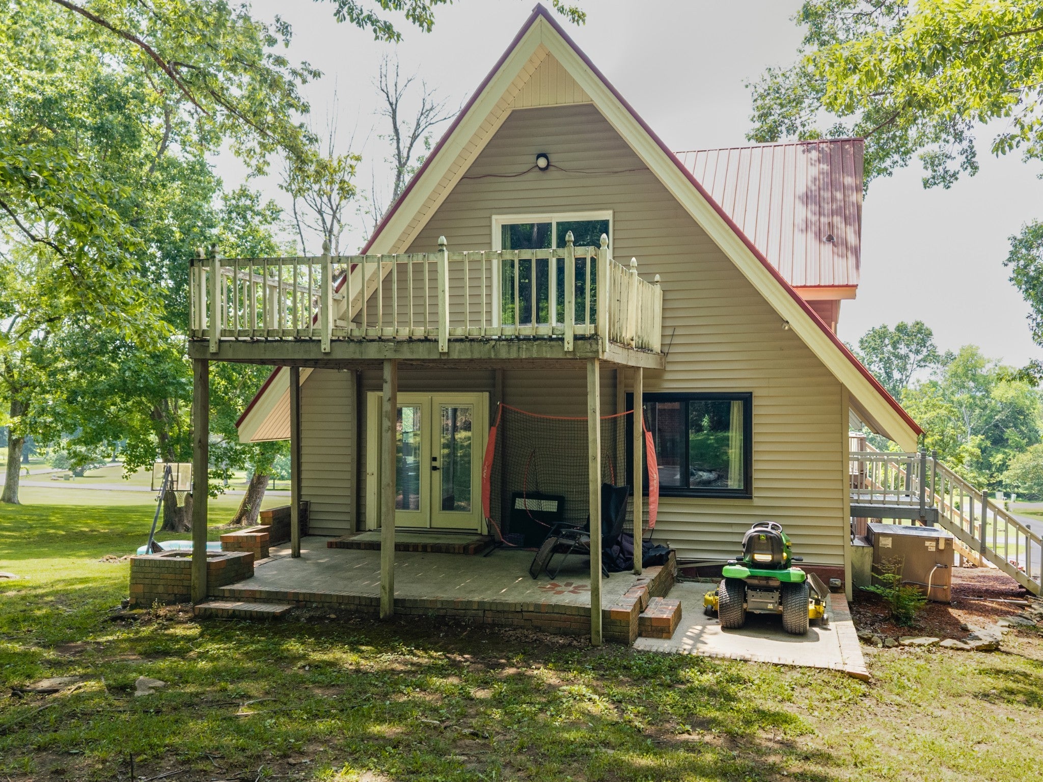 Discover the perfect blend of character and comfort in this stunning 3BR 3BA A-frame home, nestled on 2 peaceful acres with private lake access. Whether you're seeking a weekend retreat or a full-time residence, this one-of-a-kind property offers the best of both nature and modern living. Inside you'll find a spacious, light-filled interior with soaring ceilings and oversized windows that bring the outdoors in. The remodeled kitchen is a showstopper, featuring updated cabinetry, butcher block countertops, a farmhouse sink, and stainless steal appliances. Each bedroom offers its own bath for ultimate convenience and privacy, and the open-concept living and dining areas flow beautifully to outdoor spaces. Step outside to enjoy wooded surroundings, lake access for fishing or kayaking, and plenty of room to explore, garden, or simply relax. The finished basement provides additional living space, ideal for a game room, media room, guest suite, or home office. With modern upgrades, timeless architecture, and unbeatable setting, this property is the perfect lake-area getaway.