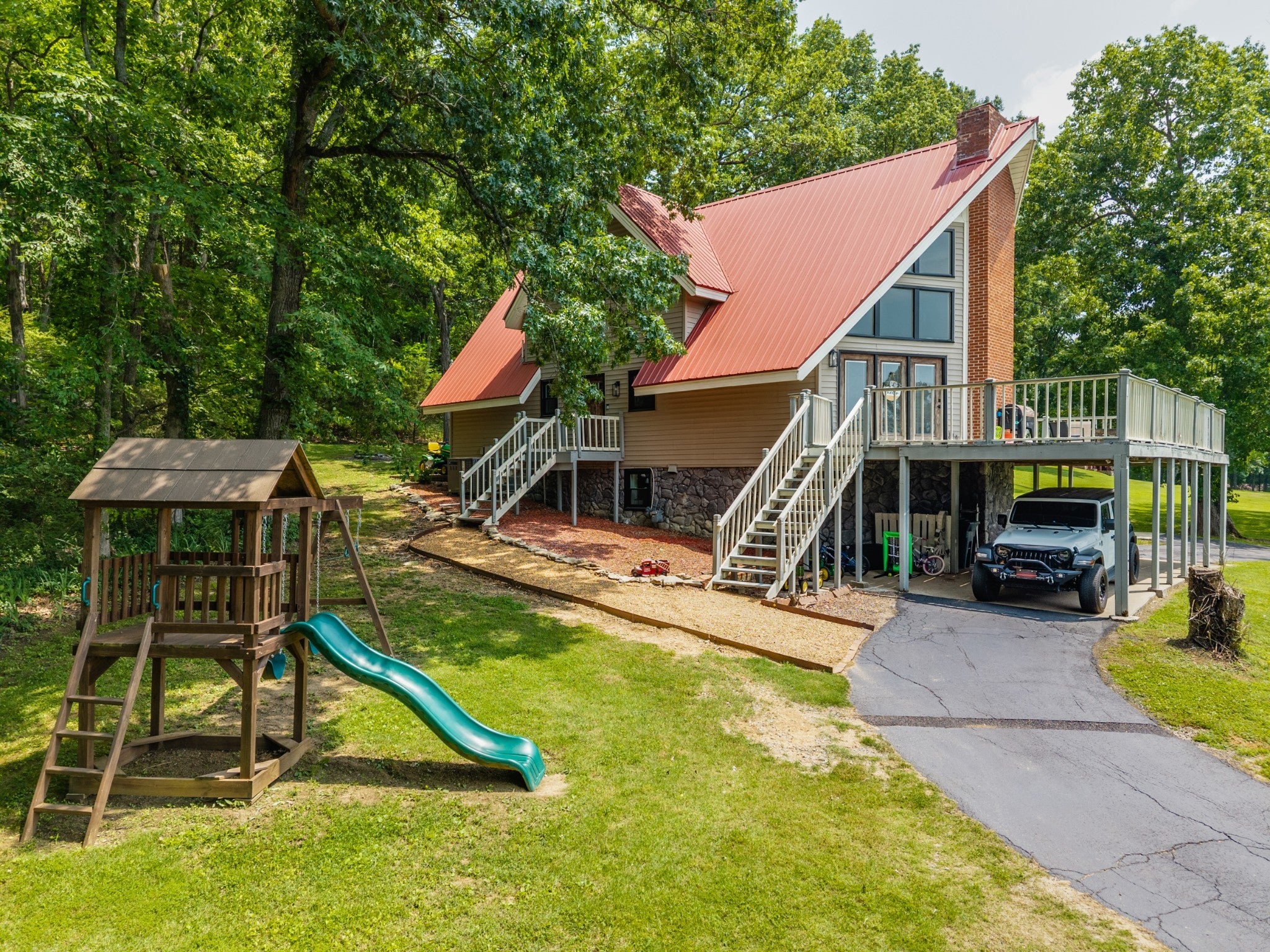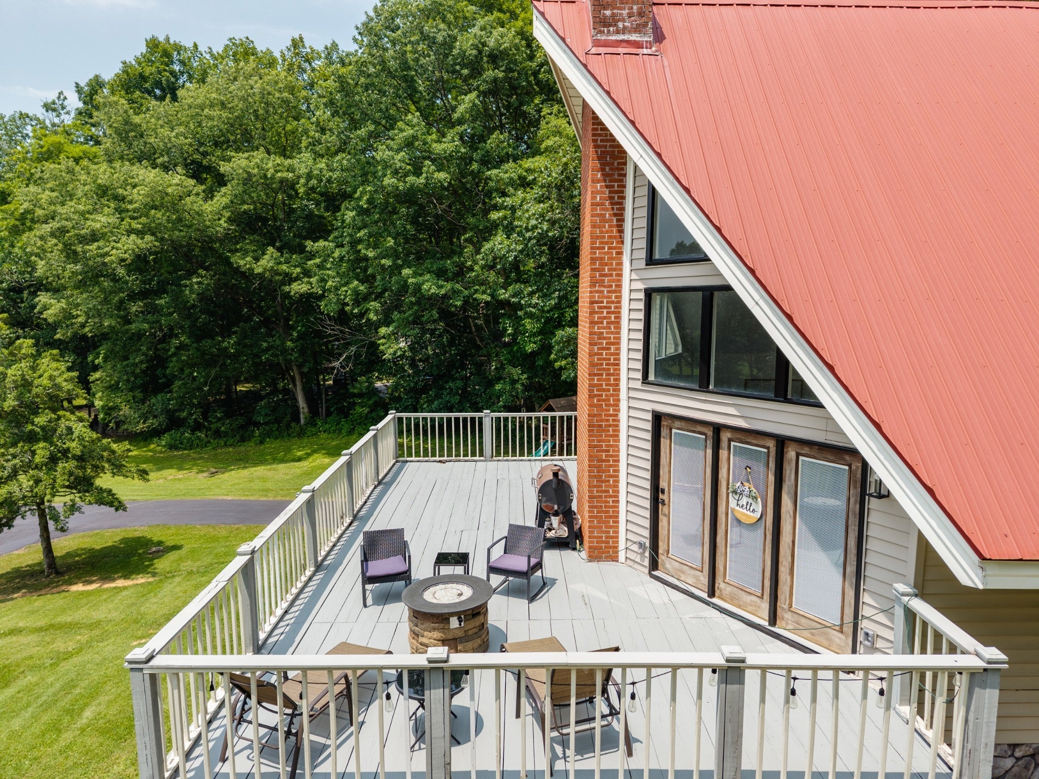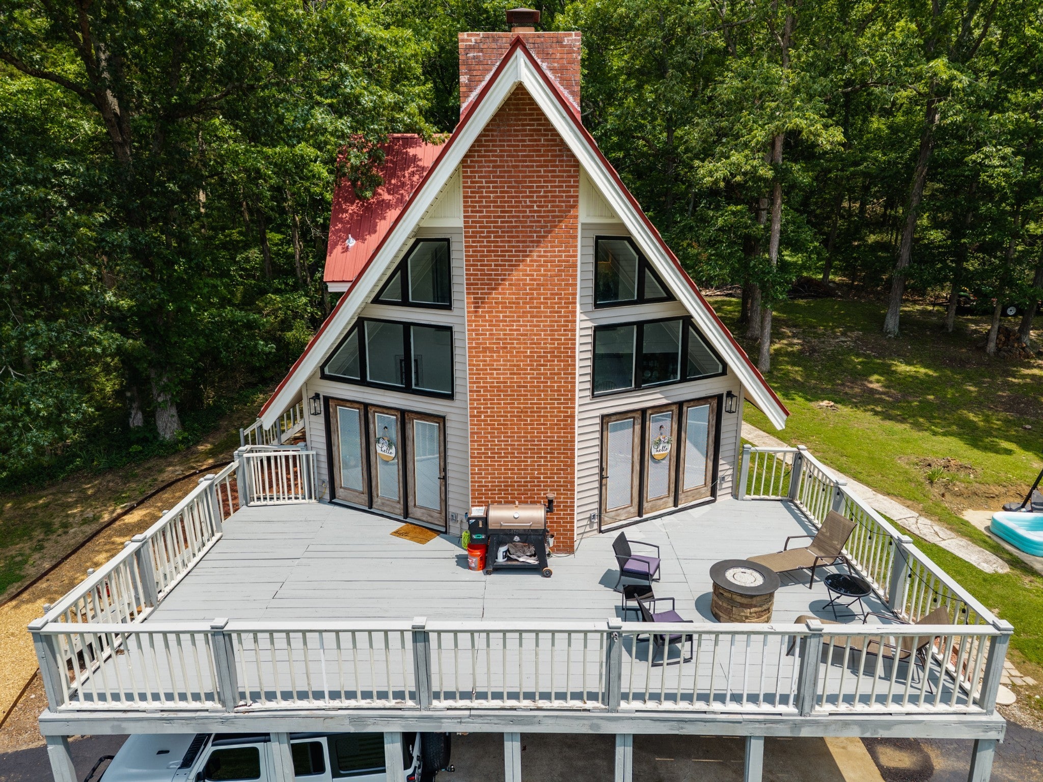 Discover the perfect blend of character and comfort in this stunning 3BR 3BA A-frame home, nestled on 2 peaceful acres with private lake access. Whether you're seeking a weekend retreat or a full-time residence, this one-of-a-kind property offers the best of both nature and modern living. Inside you'll find a spacious, light-filled interior with soaring ceilings and oversized windows that bring the outdoors in. The remodeled kitchen is a showstopper, featuring updated cabinetry, butcher block countertops, a farmhouse sink, and stainless steal appliances. Each bedroom offers its own bath for ultimate convenience and privacy, and the open-concept living and dining areas flow beautifully to outdoor spaces. Step outside to enjoy wooded surroundings, lake access for fishing or kayaking, and plenty of room to explore, garden, or simply relax. The finished basement provides additional living space, ideal for a game room, media room, guest suite, or home office. With modern upgrades, timeless architecture, and unbeatable setting, this property is the perfect lake-area getaway.