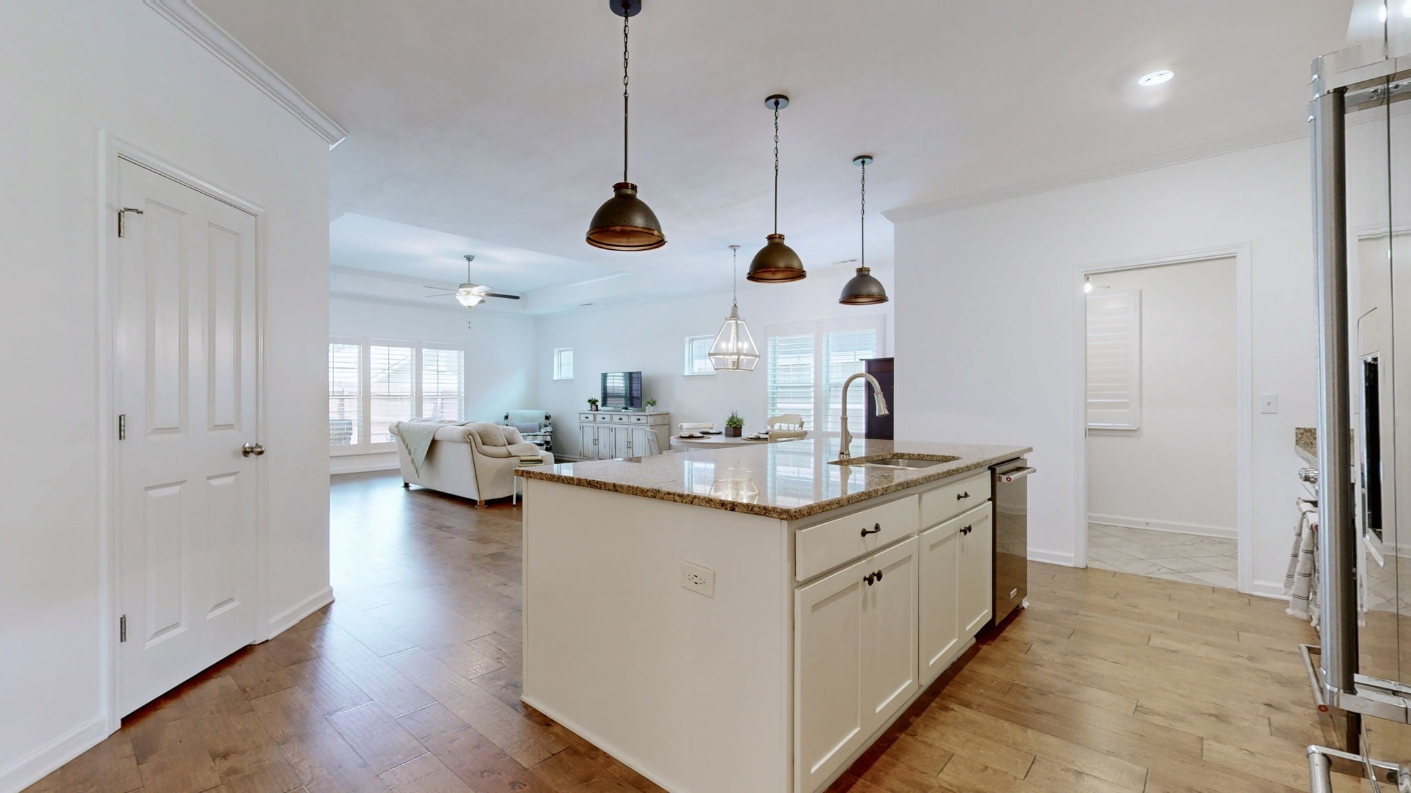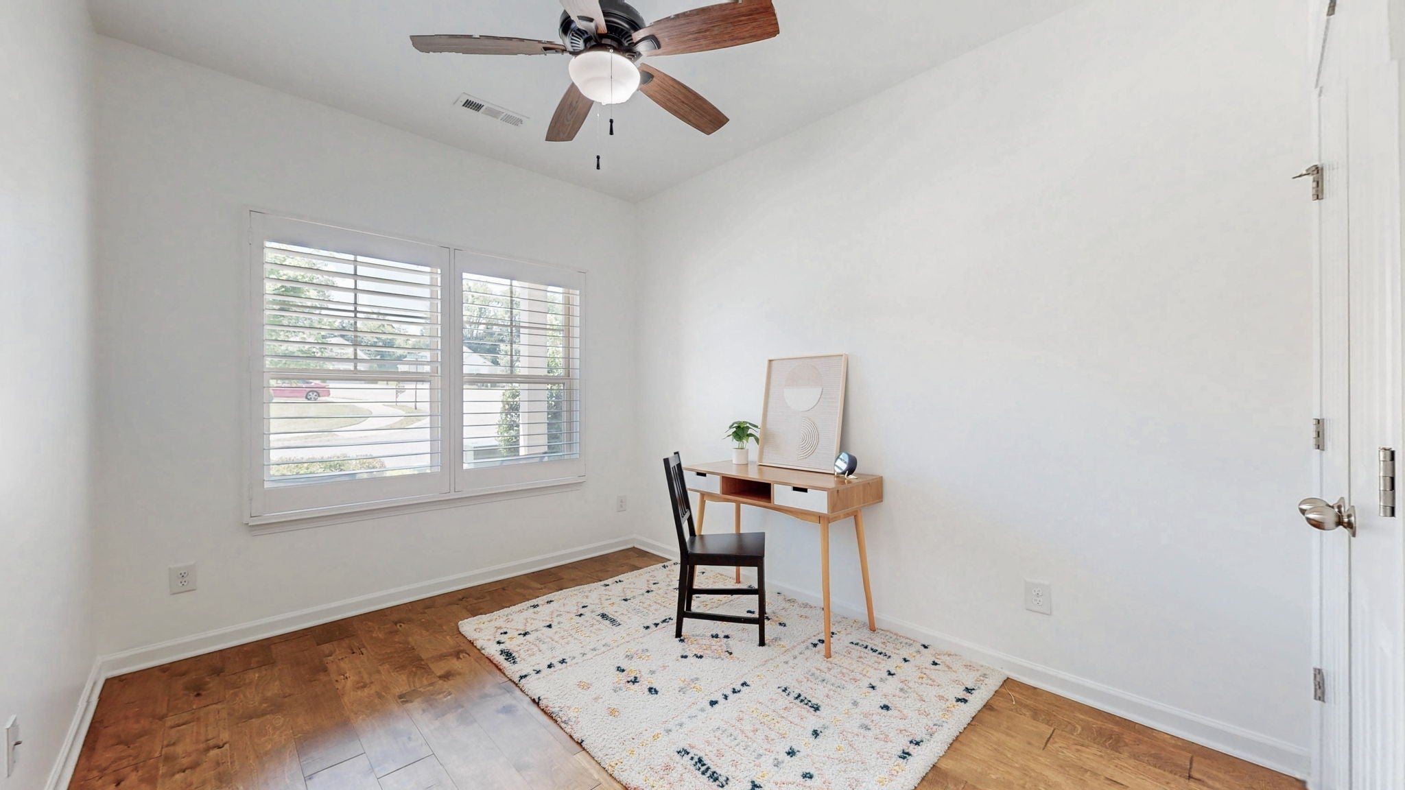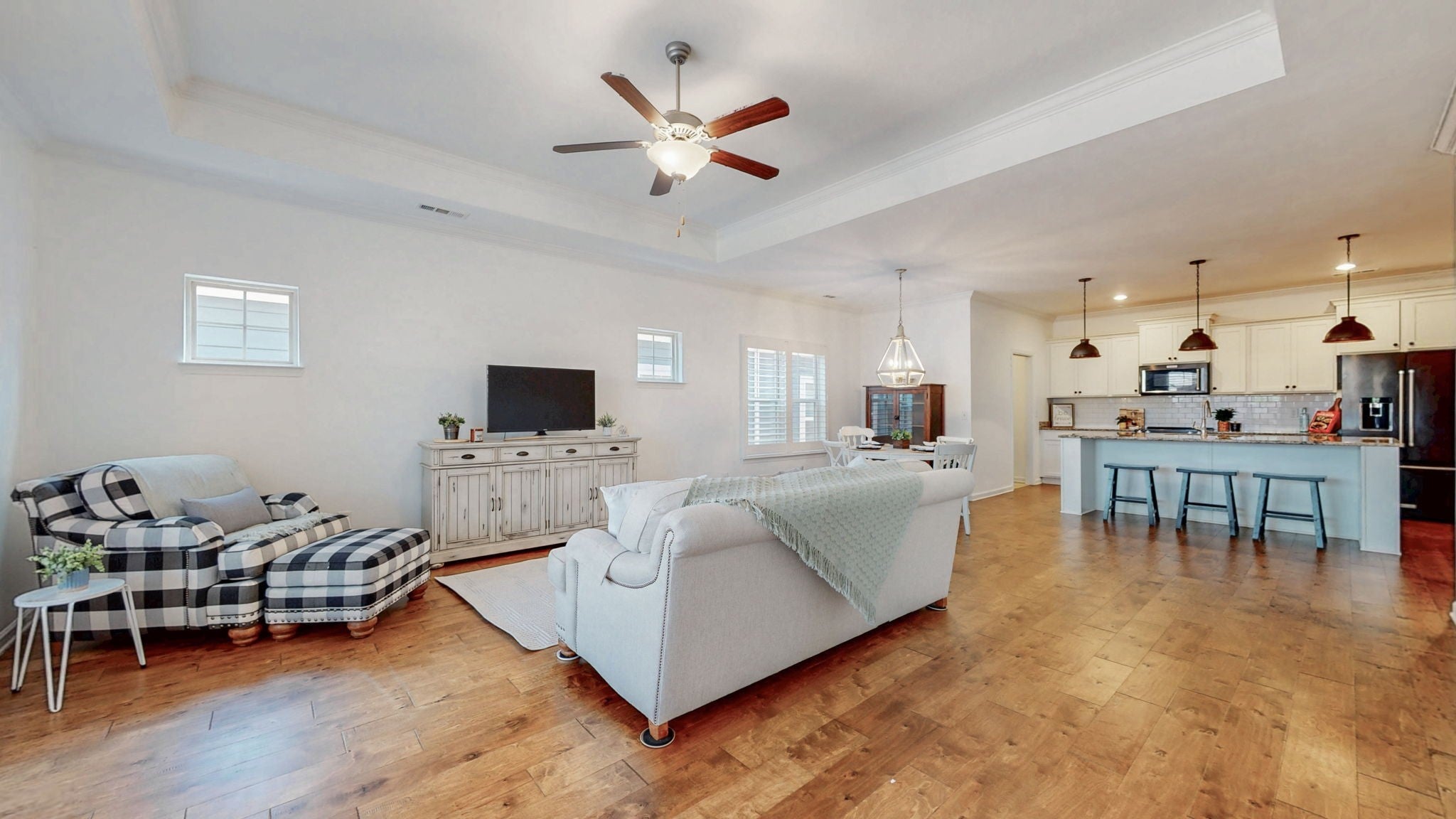MOTIVATED SELLER NEEDING A BUYER! Like new, TURN KEY all one level beautiful home! Featuring all new fresh paint throughout and beautiful hardwood floors, the open-concept design showcases a stunning kitchen with white cabinetry, granite counters, subway tile backsplash, and modern KitchenAid Pro Series dark stainless steel appliances. You'll also enjoy energy-efficient appliances and a whole-house salt water softener/filtration, making life that much easier (and greener). The thoughtful split floor plan places the owner's suite on one side, while the two additional bedrooms and bathroom occupy their own separate wing for maximum privacy. Seamless indoor-outdoor living shines with the covered back patio overlooking a private fenced yard with elegant paver details. Additional highlights include: custom built-in wood blinds, convenient laundry room with butcher block and built-in storage, 2-car garage, and weekly lawn service for front and back yards during mowing season. The home is also wired for a security system if your client wants to have one setup. All appliances stay! Located in sought-after Arden Village, this move-in ready gem offers the perfect blend of modern comfort and convenience. Price reduced!