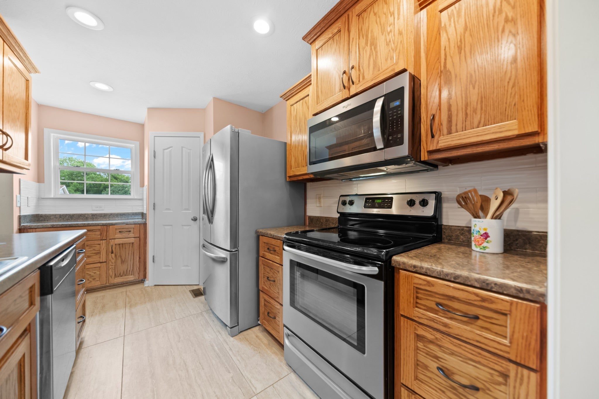 - Electric Oven, Electric Range, Dishwasher, Dryer, Microwave, Refrigerator, Stainless Steel Appliance(s), Washer