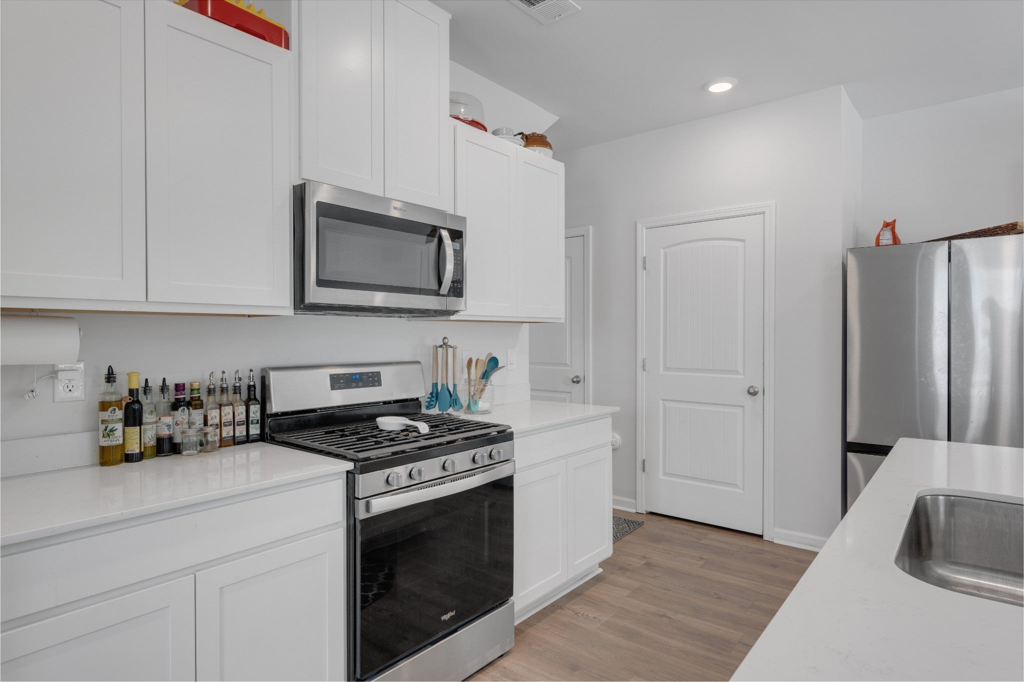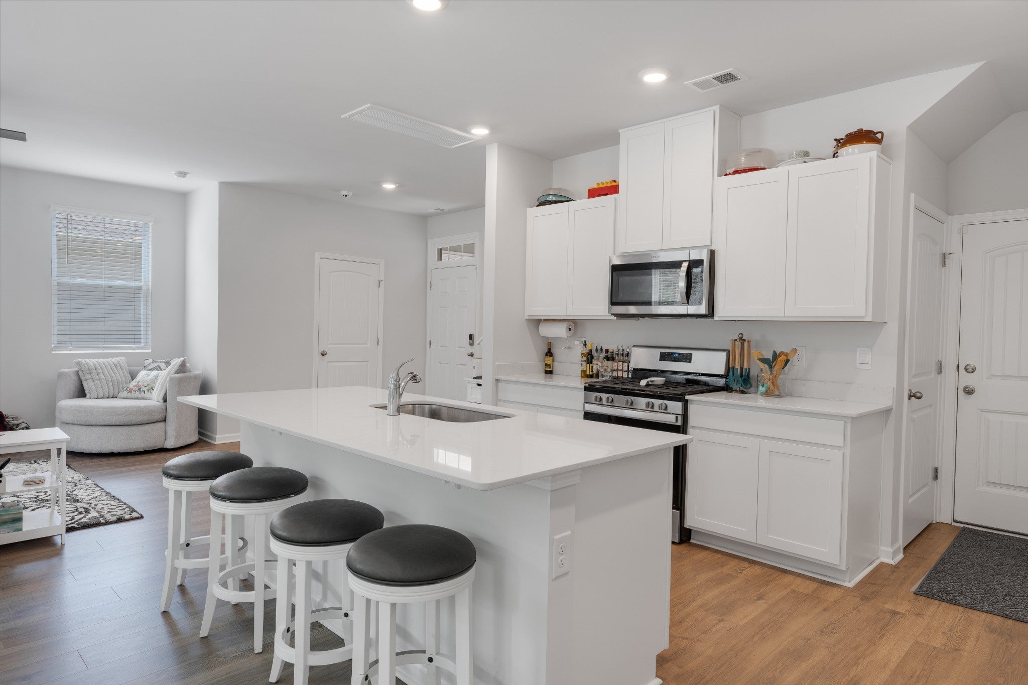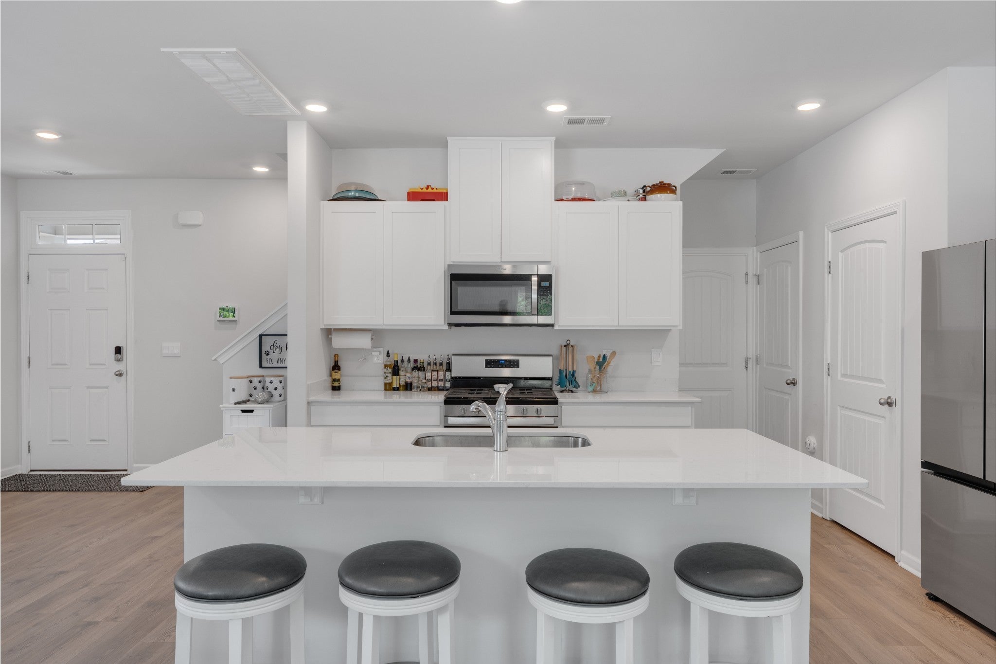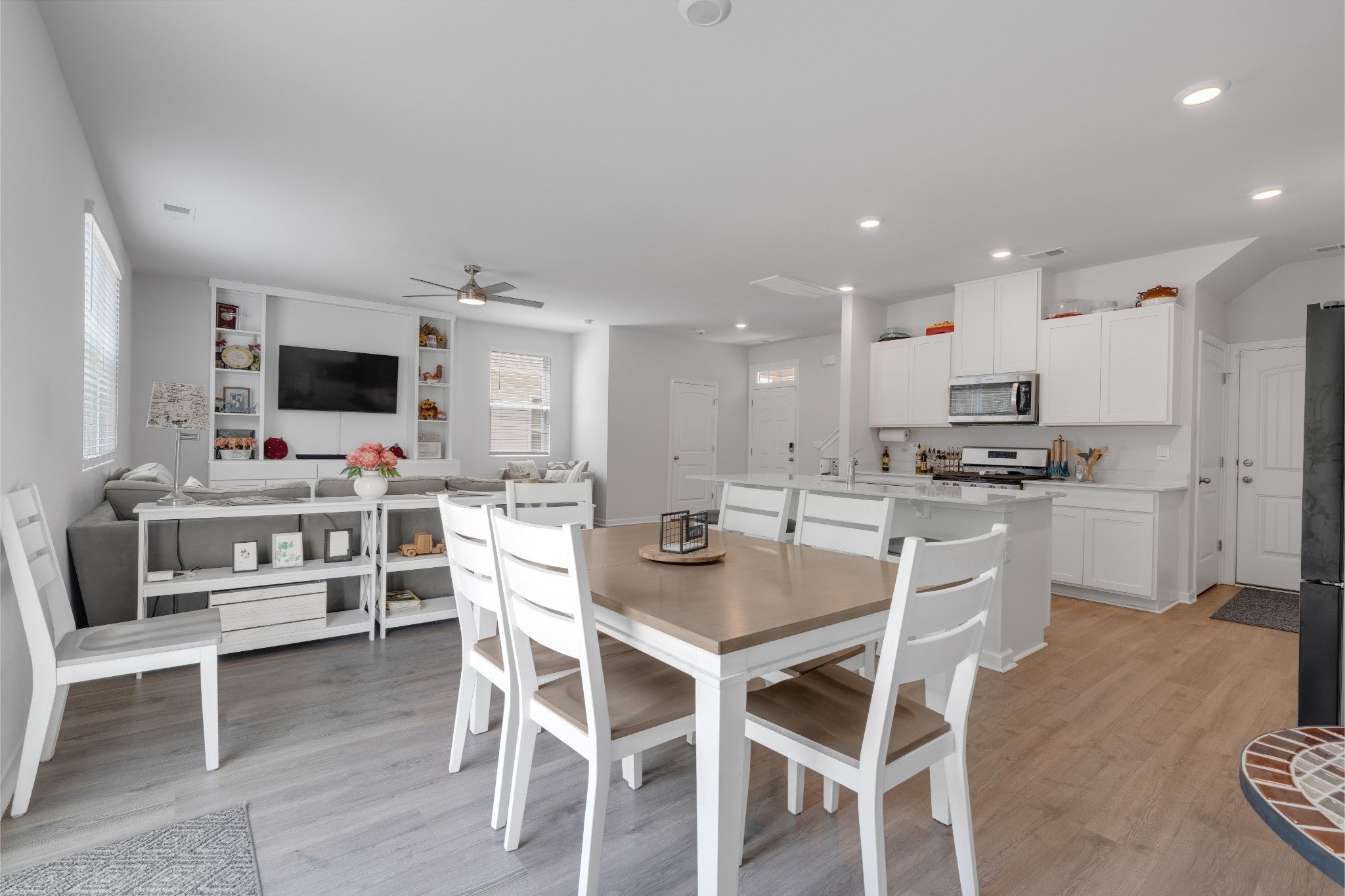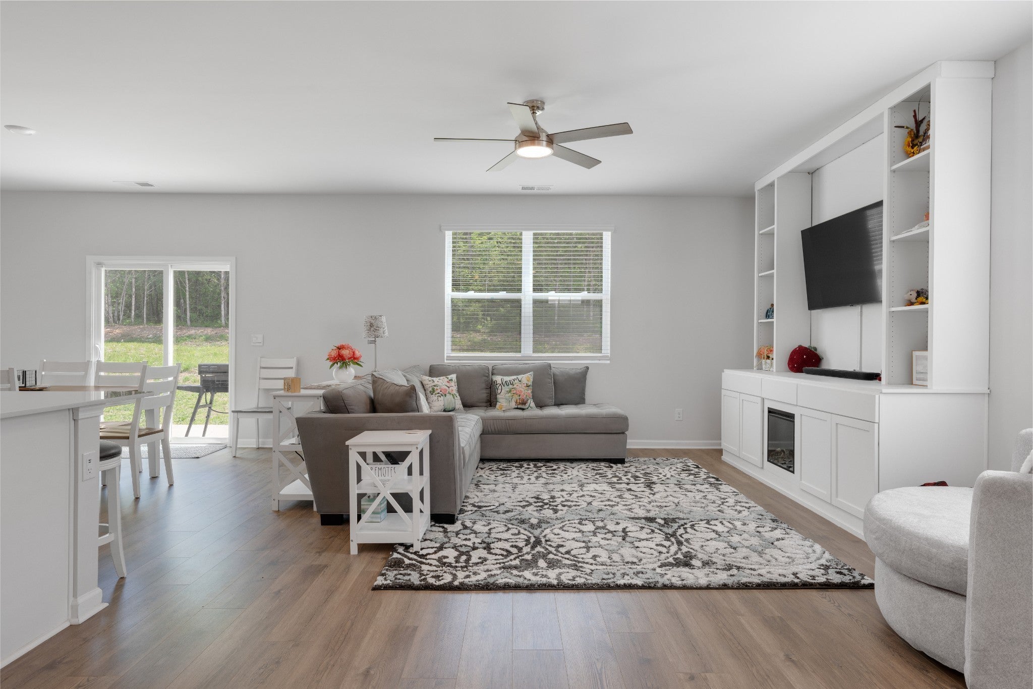 This open-concept beauty is better than a brand new home! This home is designed for the way you live today — with a gourmet kitchen that’s sure to impress. You’ll love the oversized island, 5-burner gas range, stainless steel appliances, crisp white cabinetry, and even a built-in spice drawer for those who love to cook or entertain. The spacious living and dining areas flow effortlessly, making it just as ideal for hosting friends as it is for quiet nights at home. The built in entertainment center with mounted TV makes living room a great place to see the game or watch a movie! The luxurious owner’s suite offers a true retreat with a large walk-in shower, dual vanities, and an expansive walk-in closet. Thoughtful features throughout the home include built-ins for your entertainment setup, custom bookshelves, and tons of extra storage space. Outside, relax on your private back patio or take advantage of the neighborhood's resort-style perks: a sparkling pool, large playground, scenic walking trails, and sidewalks on both sides of the street. Motivated sellers!