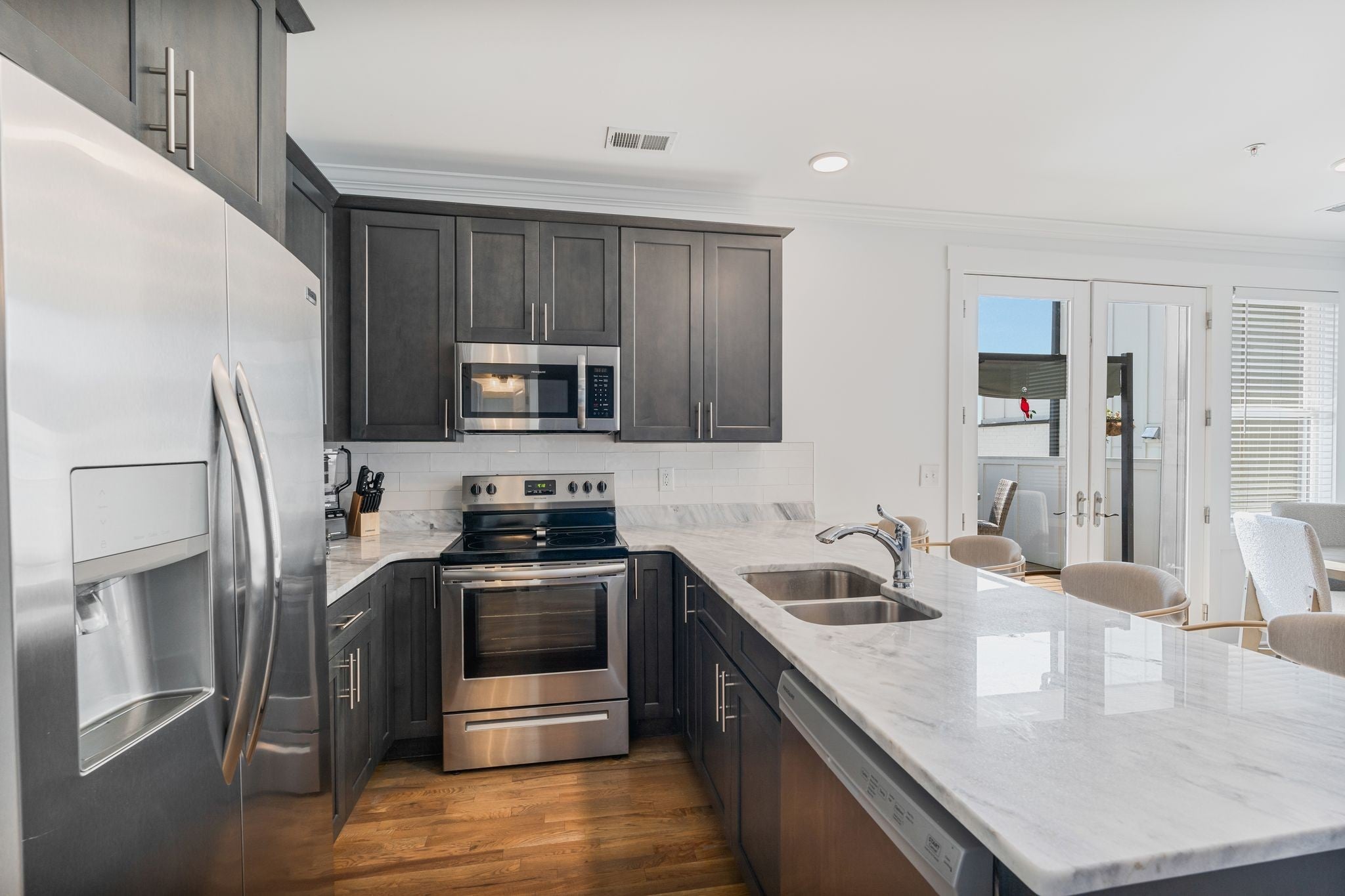 - Electric Range, Dishwasher, Disposal, Dryer, Microwave, Refrigerator, Stainless Steel Appliance(s), Washer