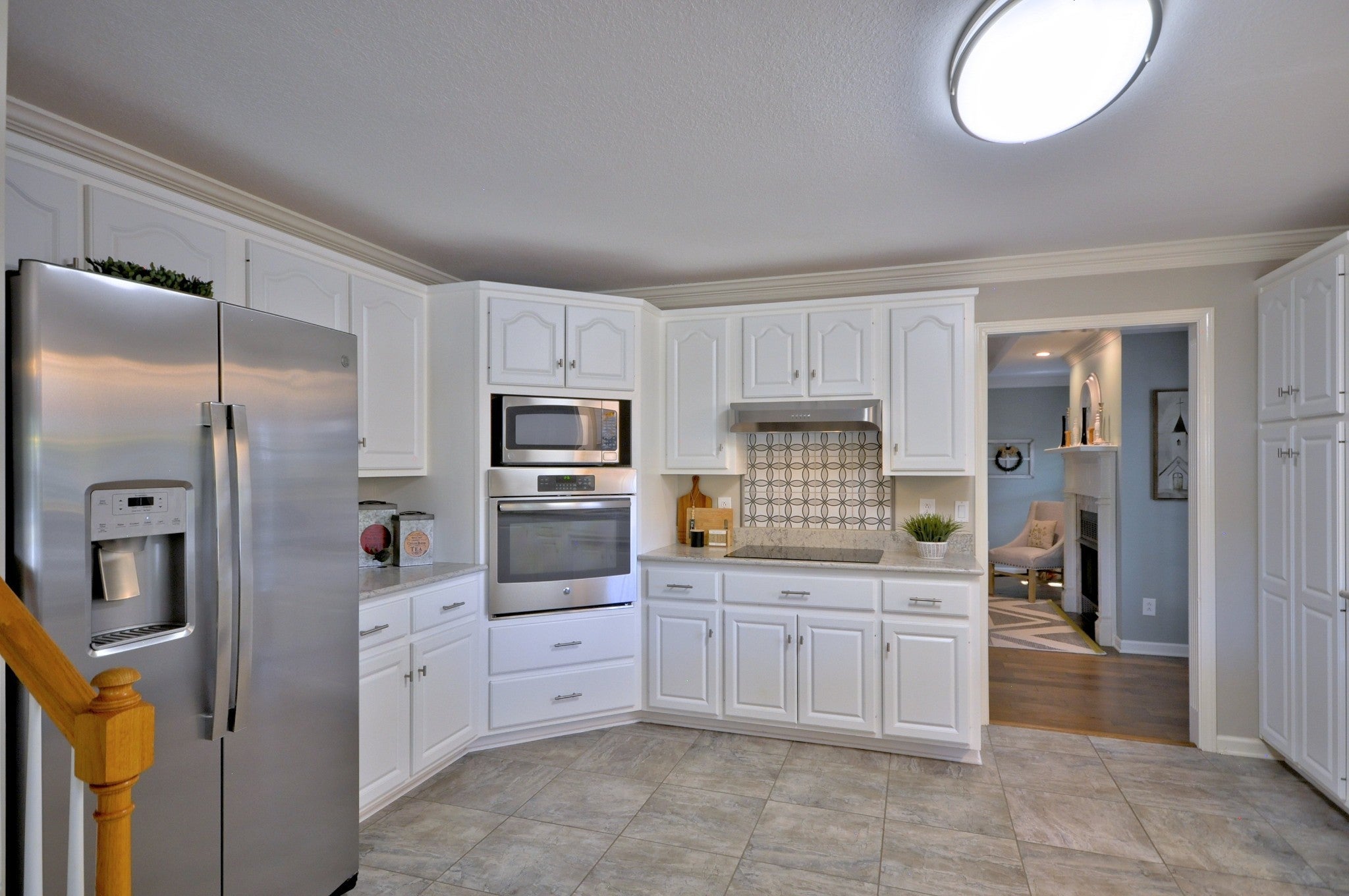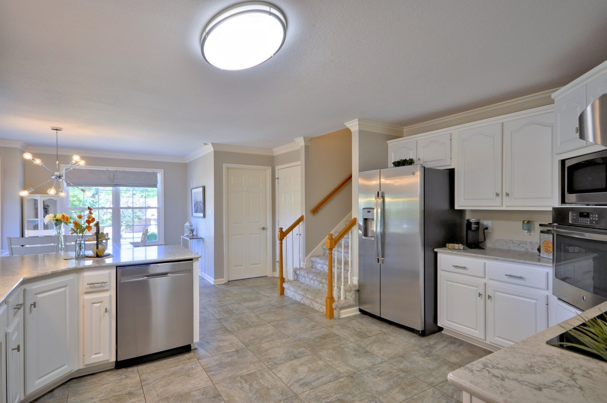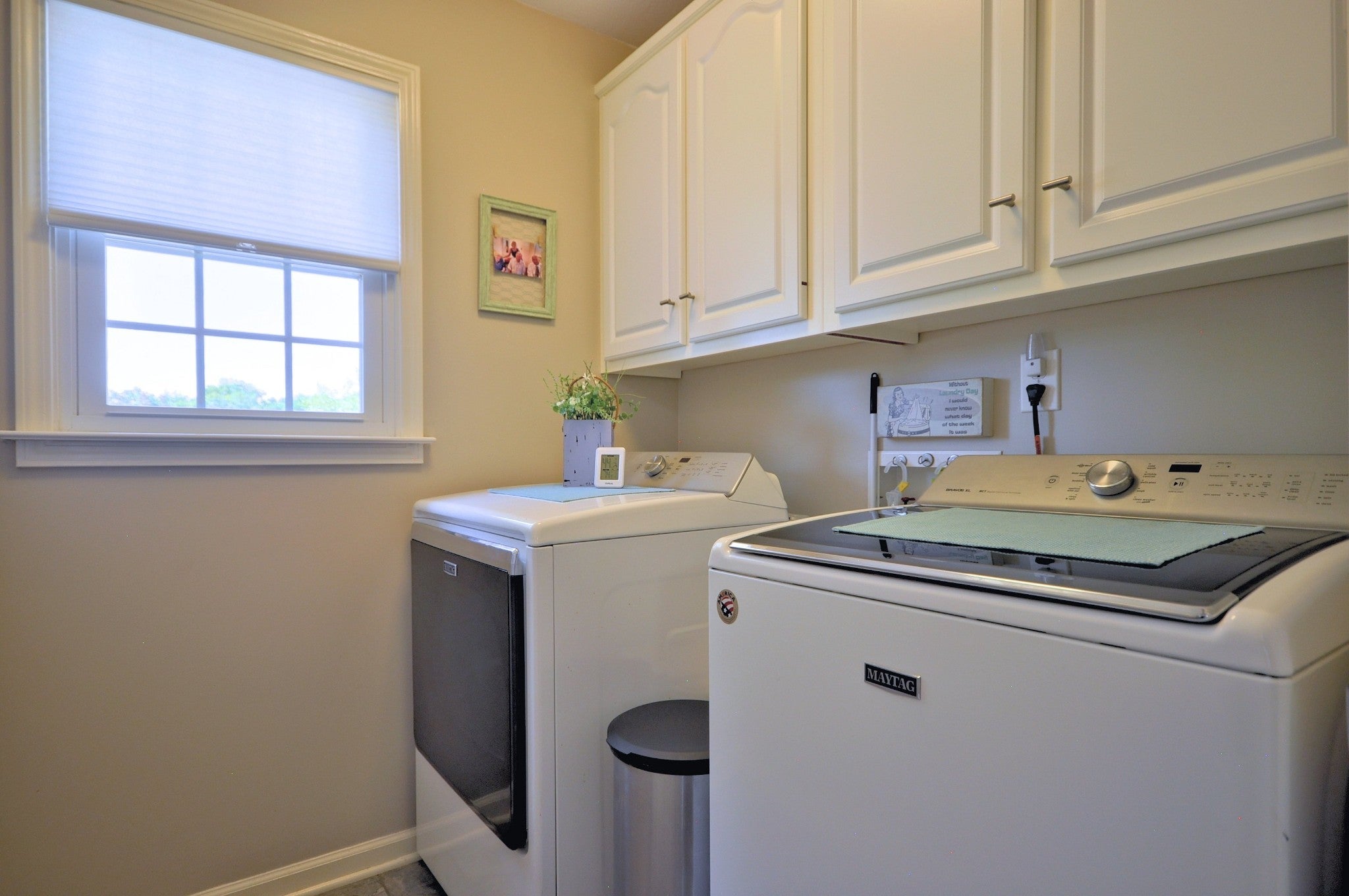 - Built-In Electric Oven, Cooktop, Dishwasher, Disposal, Dryer, Microwave, Refrigerator, Stainless Steel Appliance(s), Washer