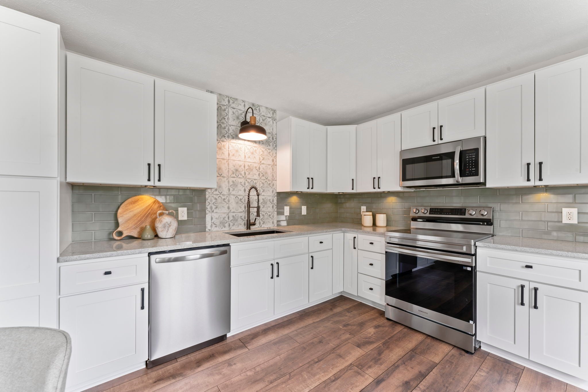 - Electric Oven, Electric Range, Dishwasher, Microwave, Refrigerator, Stainless Steel Appliance(s)