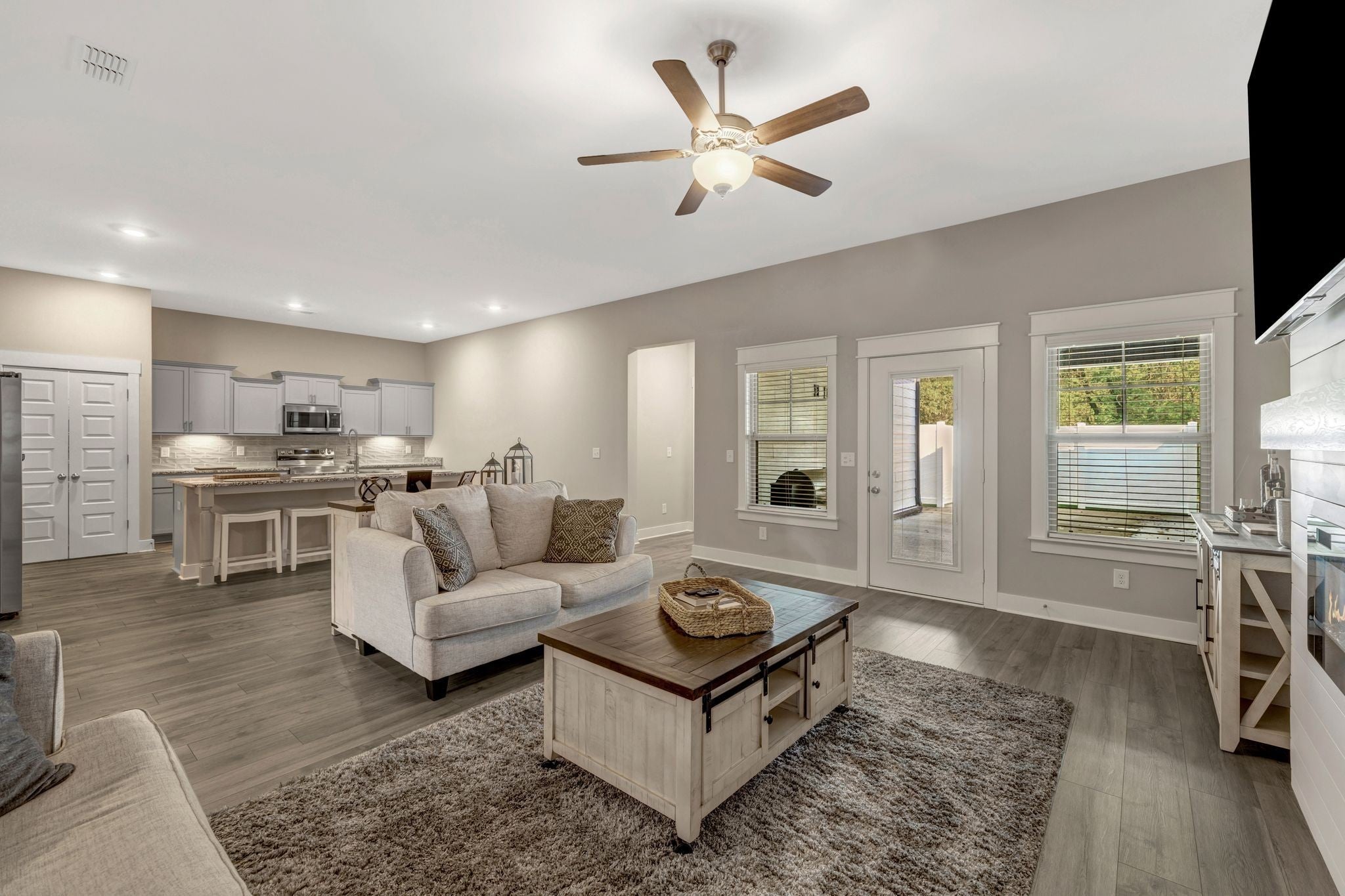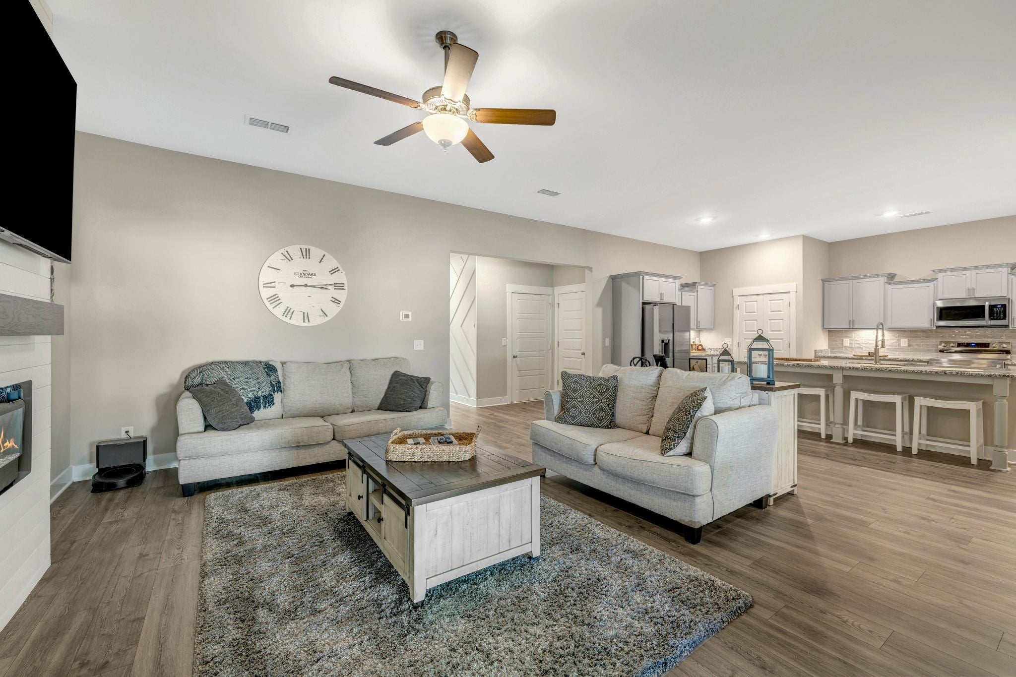 Modern Luxury Meets Effortless Living! This 2023 single-level townhome still feels brand new. It offers rare custom touches—starting with a striking ship lap fireplace that instantly sets it apart. The fiber-cement and stone exterior pairs with accent wood trim in the entry for a warm, upscale welcome. Inside, an open-concept design seamlessly connects the kitchen, dining, and living areas, creating a spacious flow perfect for entertaining. The chef’s kitchen features a generous granite island, under-cabinet lighting, and abundant cabinetry for effortless storage. Relax on the covered back porch or in the fenced patio that backs to a wooded area, giving you extra privacy and a peaceful view. The primary suite is tucked quietly at the rear with a large walk-in closet, while the second bedroom works beautifully as a guest room or office. Practical details—like a 2-car insulated garage and a roomy laundry—complete the package. Enjoy low-maintenance living with HOA care of exterior and grounds, all in a convenient Murfreesboro location near schools, shopping, and city amenities.